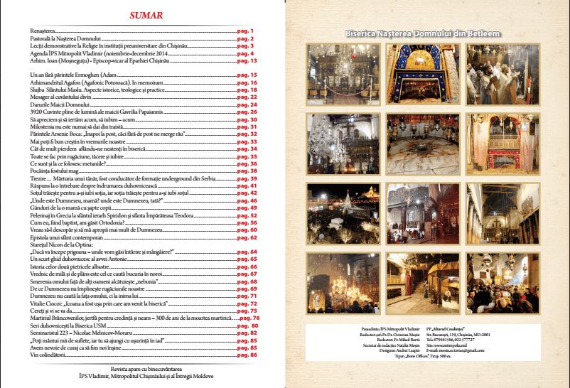 Revista poate fi procurată din magazinul de obiecte şi literatură bisericească, str. Bucureşti, 119, Mitropolia Moldovei, mun. Chişinău, tel: 23-20-73.