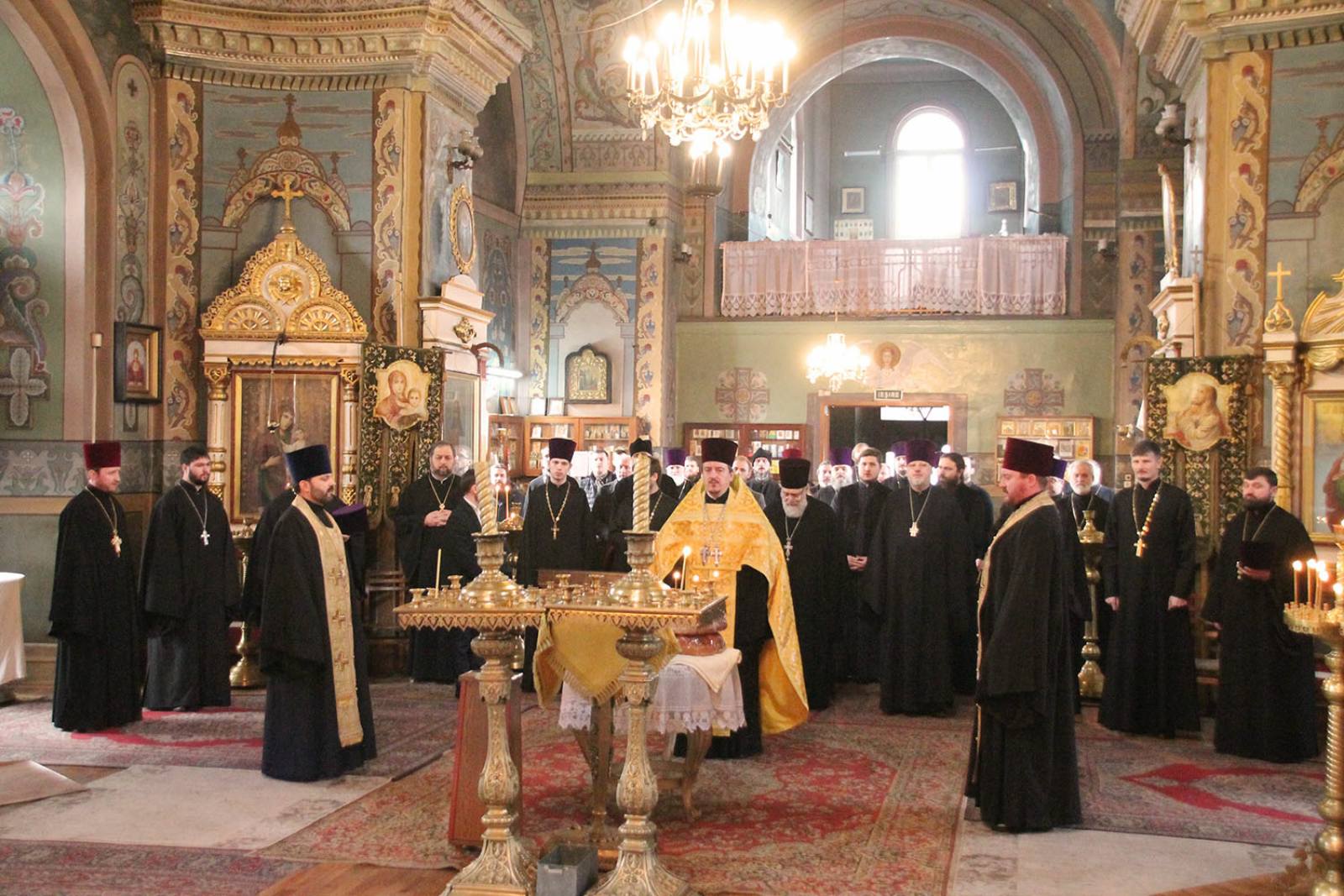 Adunarea preoților a debutat cu oficierea slujbei Tedeumului săvârșită de către părintele Protopop, urmată de Rânduiala Panihidei pentru nou-adormitul vrednicul de pomenire Arhim. Hrisostomos, fost paroh al acestei catedrale istorice.