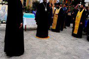 Ajunşi la mănăstire, participanţii la pelerinaj au fost întâmpinaţi, în dangătul clopotelor, de către obştea sfântului aşezământ în frunte cu părintele stareţ, arhimandritul Porfirie (Dobre).