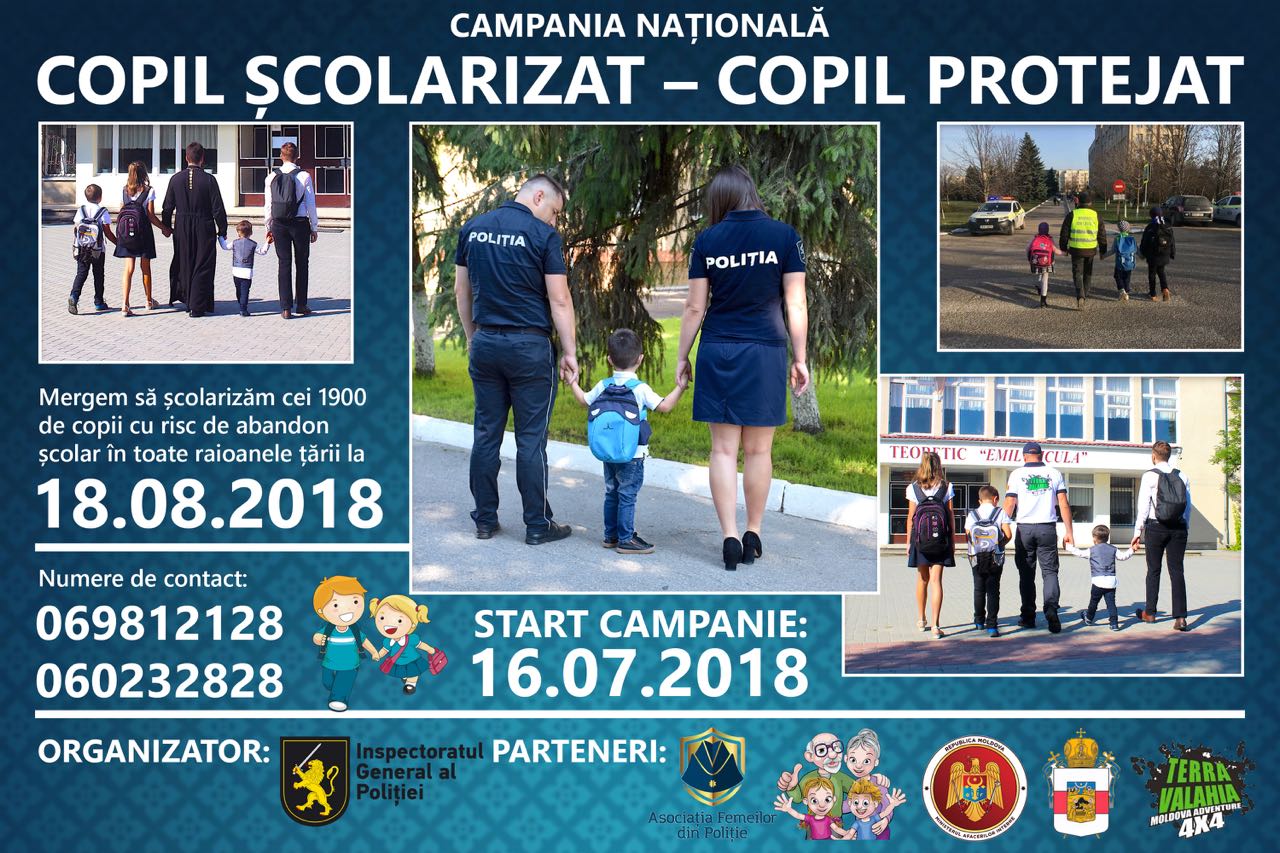 Luni, 16 iulie, Inspectoratul General al Poliției împreună cu reprezentanții Mitropoliei Chişinăului şi a Întregii Moldove, Asociațiile Obștești „Terra Valahia”, „Bunicii Grijulii” și Asociația Femeilor din Poliție, au pus baza inițierii unei Campanii naționale de binefacere,”Copil şcolarizat-copil protejat”.
