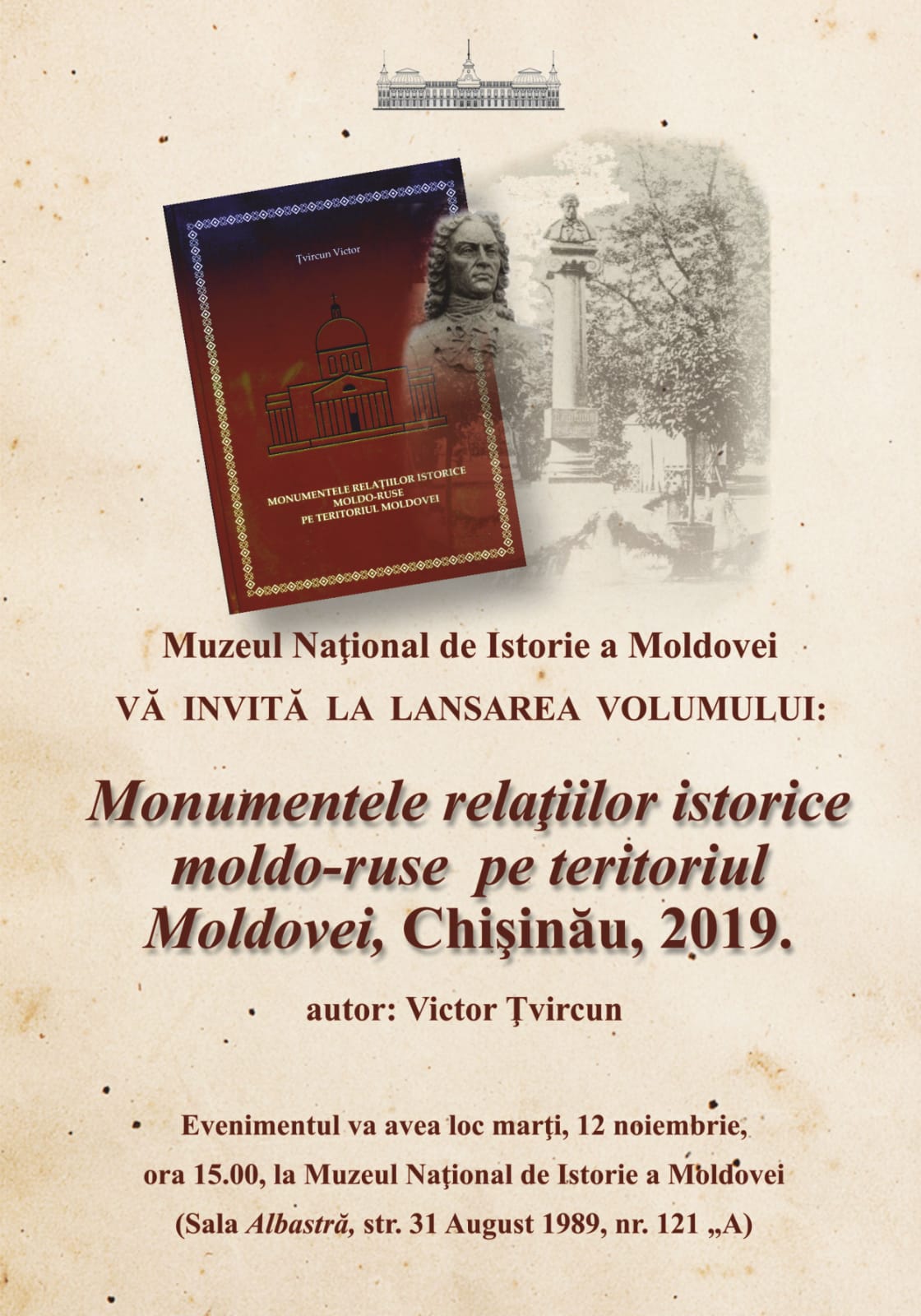Marți, 12 noiembrie curent, în incinta Muzeului Național de Istorie a Moldovei a avut loc lansarea studiului monografic „Monumentele relațiilor istorice moldo-ruse pe teritoriul Moldovei”, semnat de către Victor Țvircun, doctor habilitat, profesor universitar. Chișinău.
