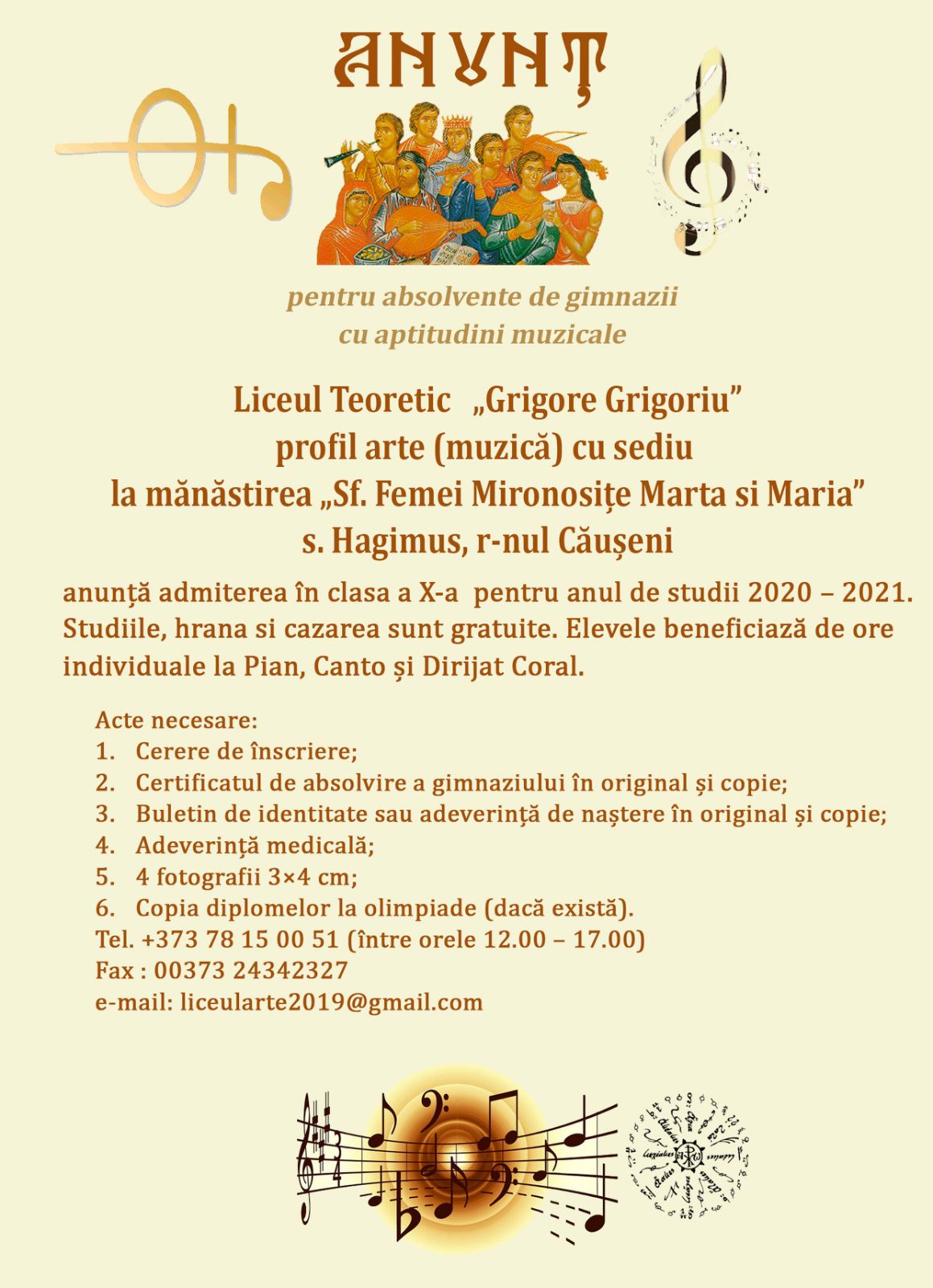 Liceul Teoretic „Grigore Grigoriu”, profil arte (muzică), cu sediu la mănăstirea „Sf. Femei Mironosițe Marta și Maria”