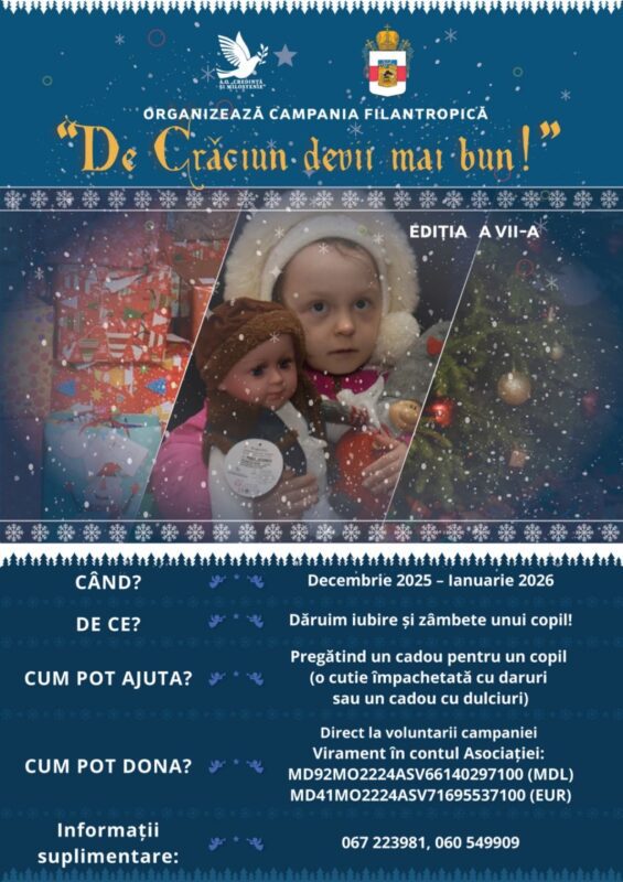Sub îndrumarea și cu binecuvântarea Înaltpreasfințitului Mitropolit Vladimir, Sectorul Sinodal Activitate Socială și Caritate al Bisericii Ortodoxe din Moldova organizează, și în acest an, cea de-a VII-a ediție a Campaniei filantropice „De Crăciun devii mai bun!”. Inițiativa are drept scop sprijinirea a sute de familii social-vulnerabile din întreaga țară, aducând speranță, mângâiere și bucurie în inimile copiilor defavorizați.