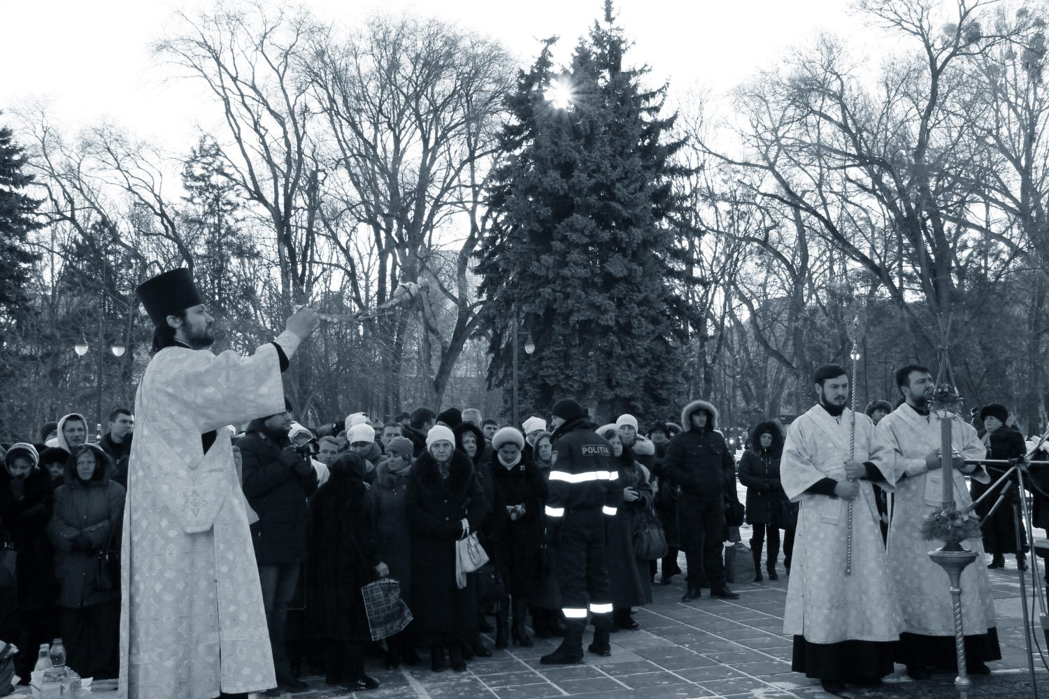 Să ne rugăm Domnul Iisus Hristos să ne dăruiască bucuria de a fi binecuvântați cu apa sfințită, noi și casele noastre, cei dragi ai noștri și toate activitățile noastre, pentru ca viața noastră să fie lumină din lumina lui Hristos și bucurie din bucuria sfinților, spre slava Preasfintei Treimi și spre a noastră mântuire. Amin”.
