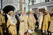 După terminarea Dumnezeieștii liturghii o mulțime de oameni l-au salutat pe Întâistătătorul Bisericii Ortodoxe Ruse cu strigăte de bucurie: „Patriarhul nostru Chiril”.