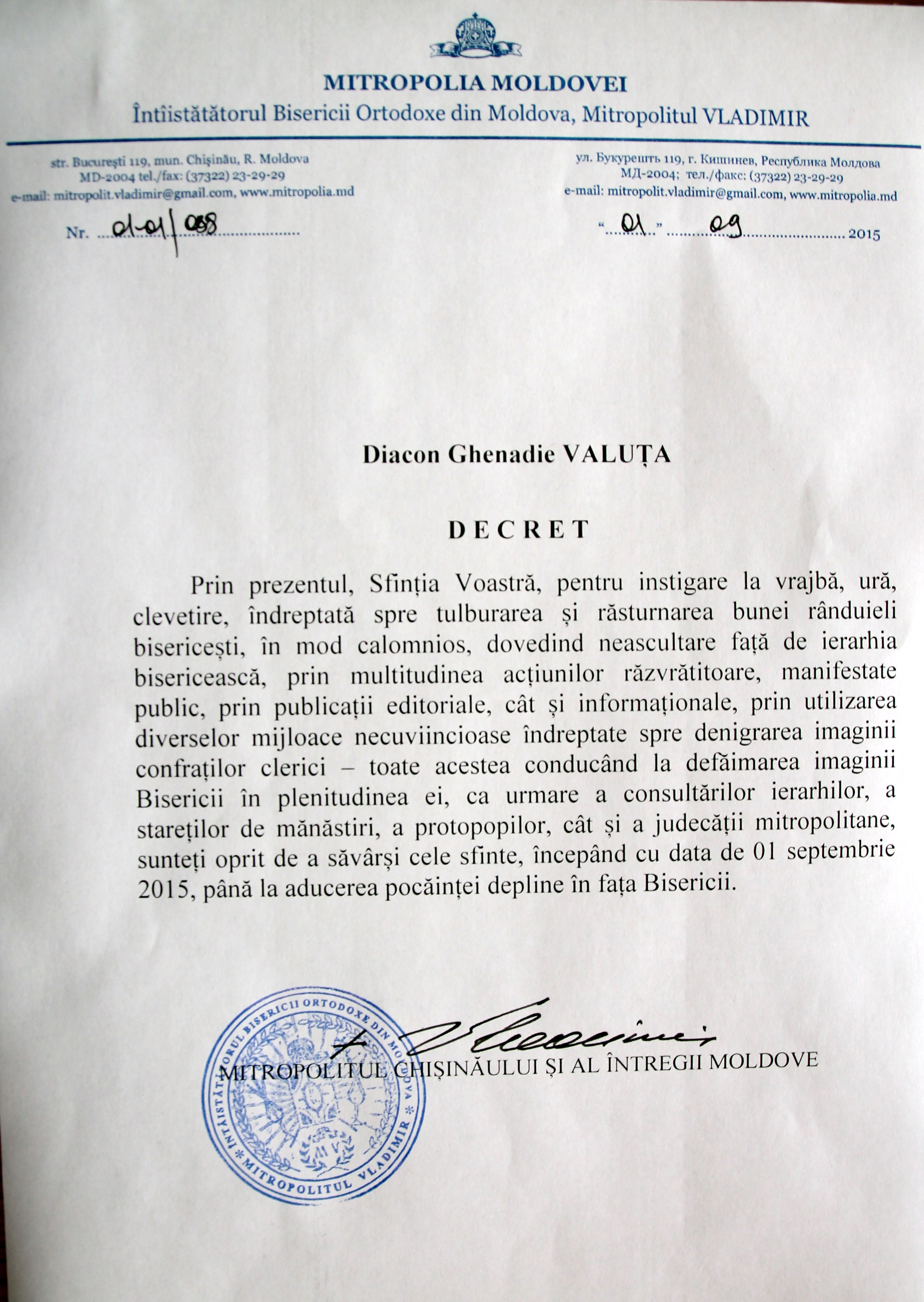 Prin Decretul semnat de Înaltpreasfinţitul Mitropolit Vladimir la data de 01.09.2015, diaconul Ghenadie Valuţa este oprit de a săvârşi cele sfinte, conform documentului de mai jos: