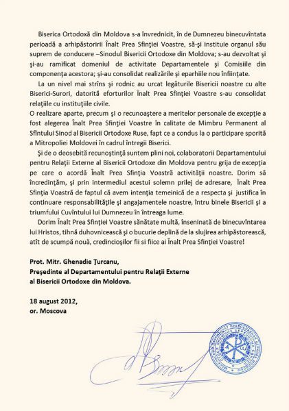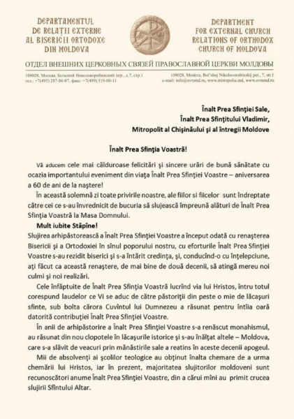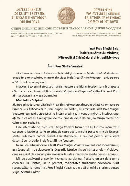 Publicăm textul felicitării Presedintelui Departamentului Relatii Externe a Bisericii Ortodoxe din Moldova, protoiereului mitrofor Ghenadie Turcanu, adresat Mitropolitului Vladimir cu ocazia aniversării de 60 de ani de la nastere.