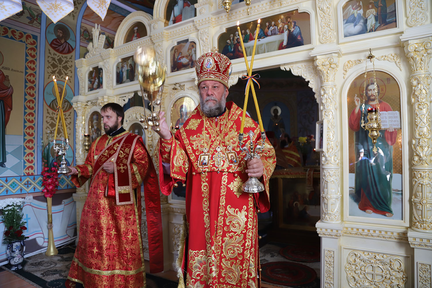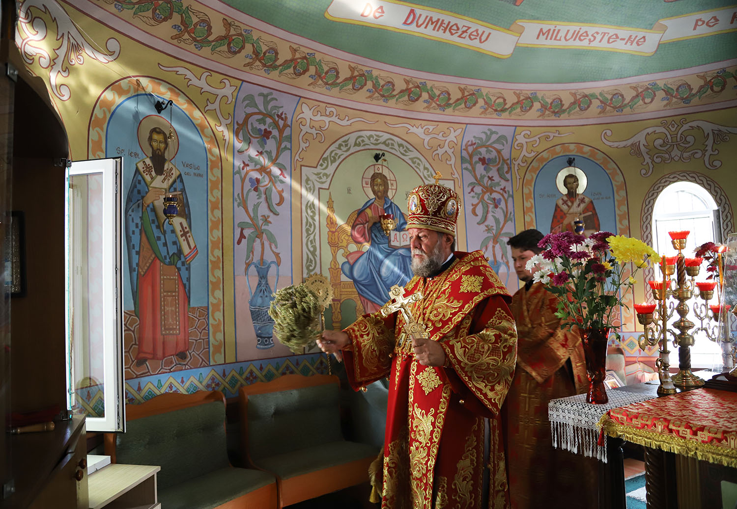După întâmpinarea arhiereului a urmat Slujba de Sfințire a bisericii, după ample lucrări de renovare și instalarea noului iconostas.