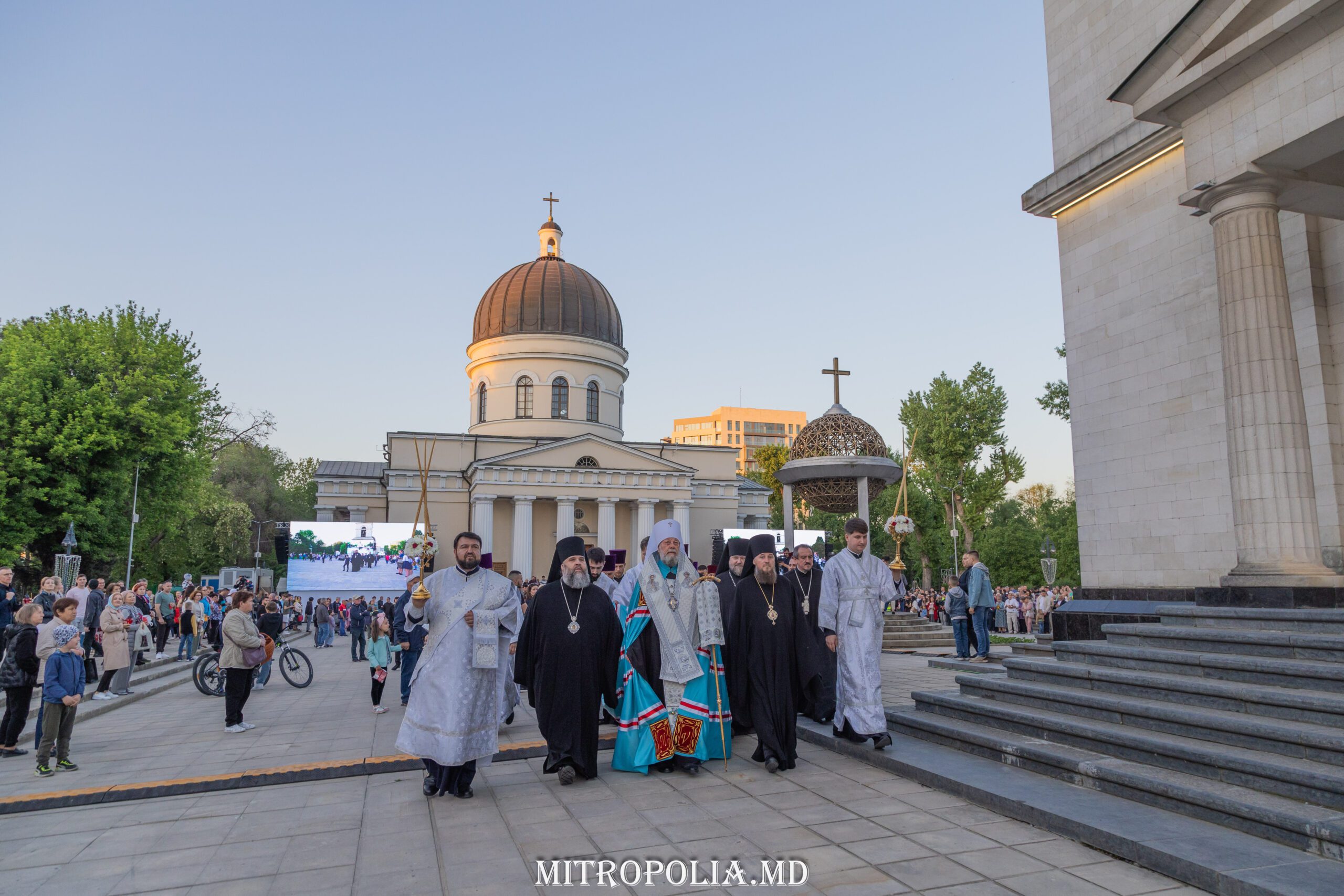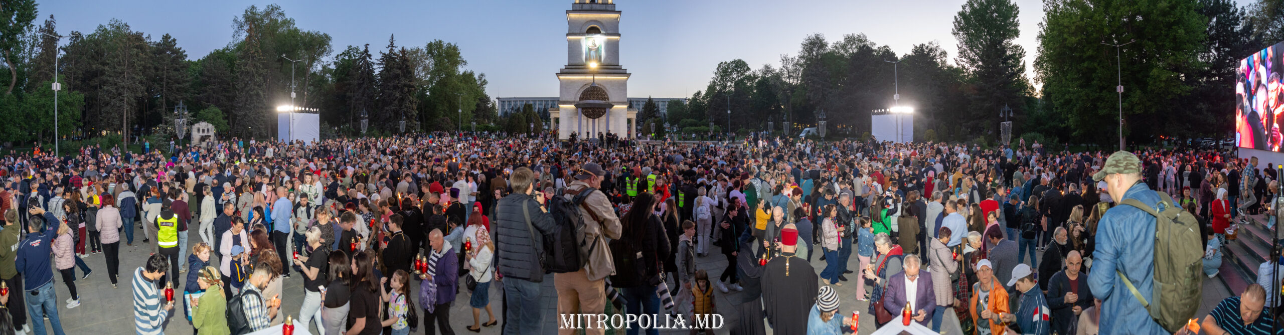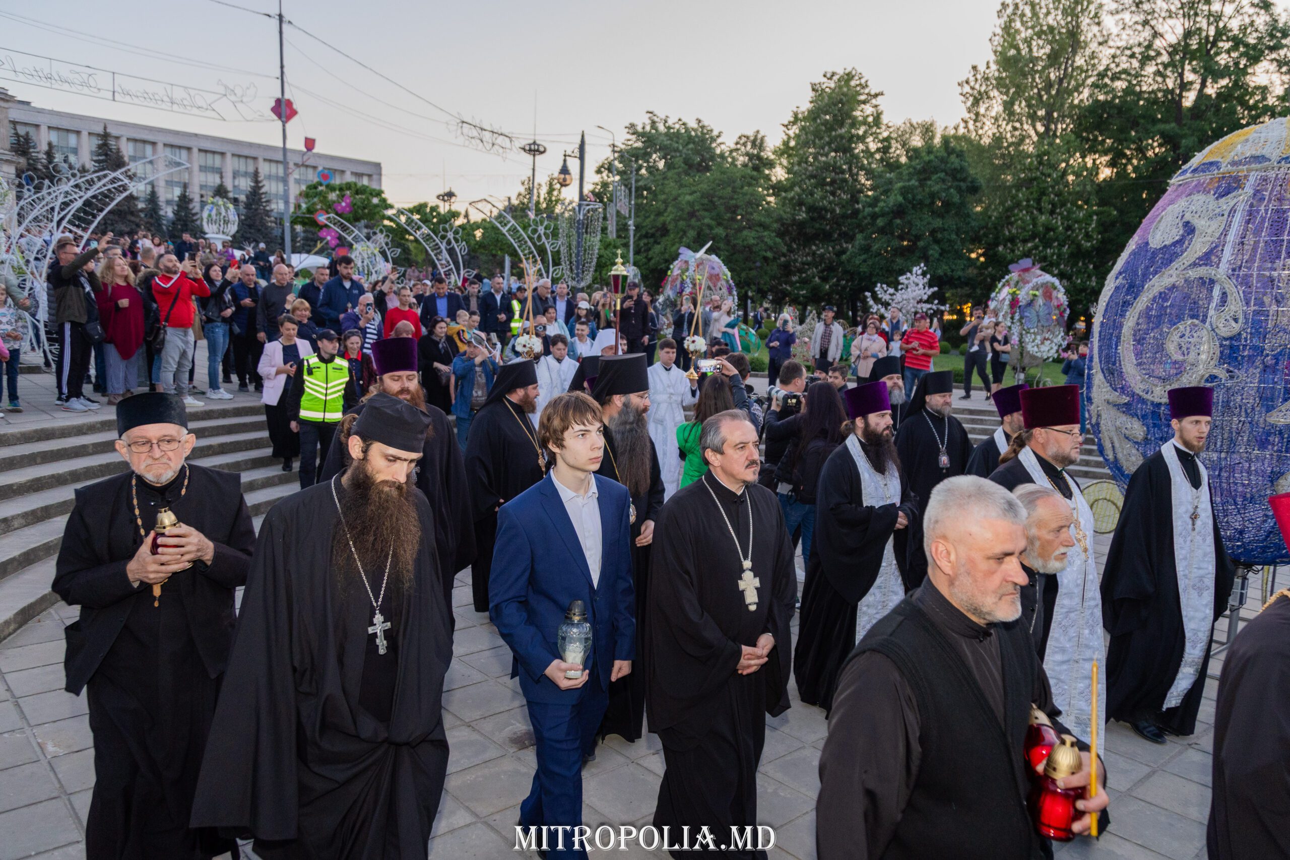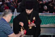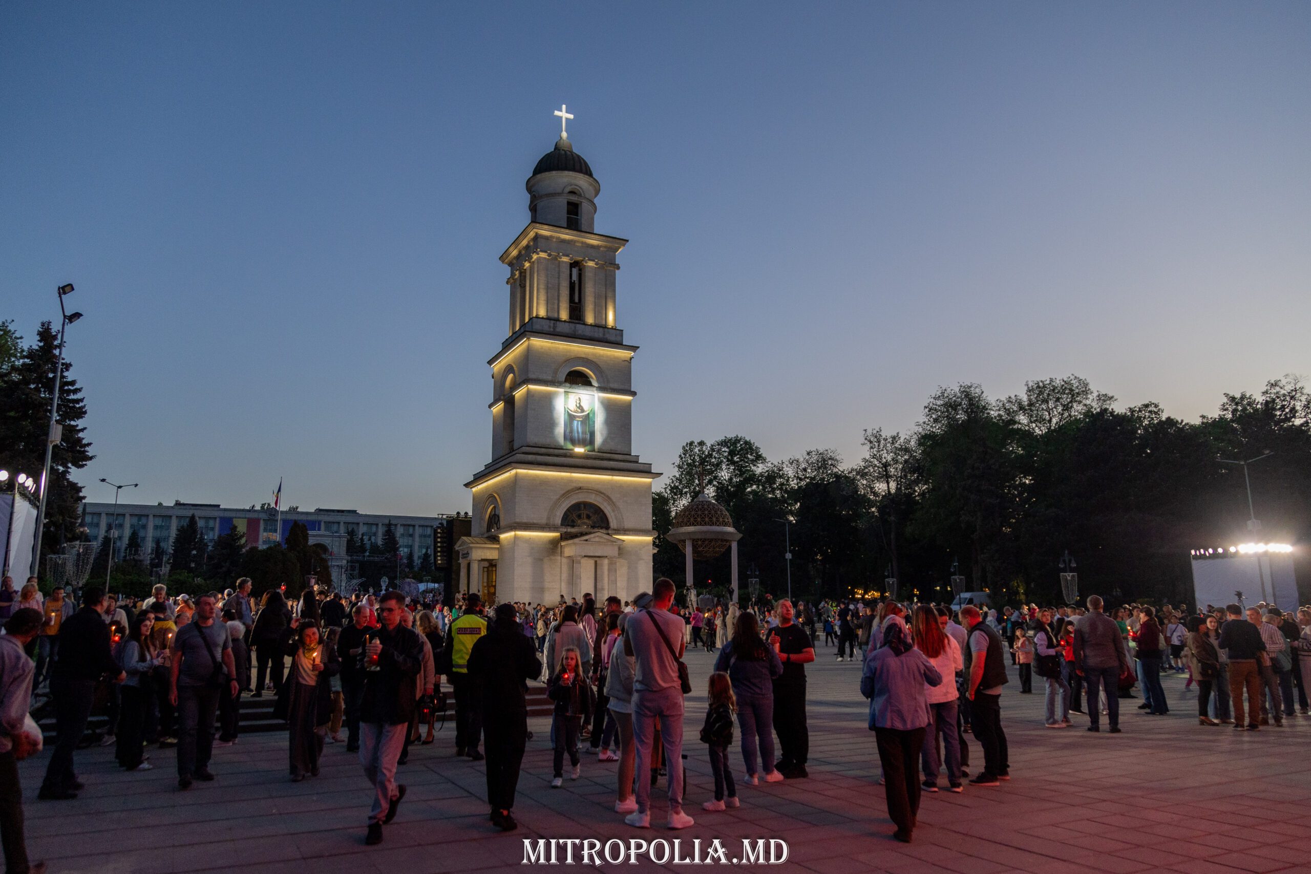 În seara zilei, în scuarul catedralei mitropolitane, Întâistătătorul Bisericii Ortodoxe din Moldova, Înaltpreasfințitul Vladimir, Mitropolitul Chișinăului și al întregii Moldove însoțit de episcopii-vicari: PS Ioan de Soroca, PS Siluan de Orhei, PS Nicolae de Ceadîr-Lunga, vicar al eparhiei de Cahul și Comrat, prot. mitr. Vadim Cheibaș, secretar mitropolitan și eclesiarh al catedralei, un sobor preoțesc și mulțimea de creștini veniți de pretutindeni, au întâmpinat la Arcul de Triumf, Sfânta Lumină de la Ierusalim.