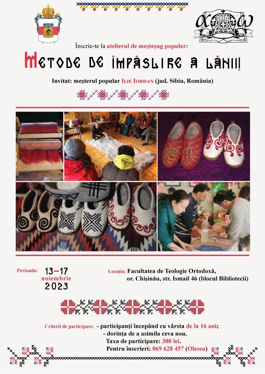 Cu binecuvântarea ÎPS Mitropolit Vladimir, Sectorul Sinodal Activitate Socială și Caritate al Mitropoliei Moldovei în colaborare cu Academia de Teologie Ortodoxă din Moldova organizează atelierul de meșteșug popular: „Metode de împâslire a lânii”.