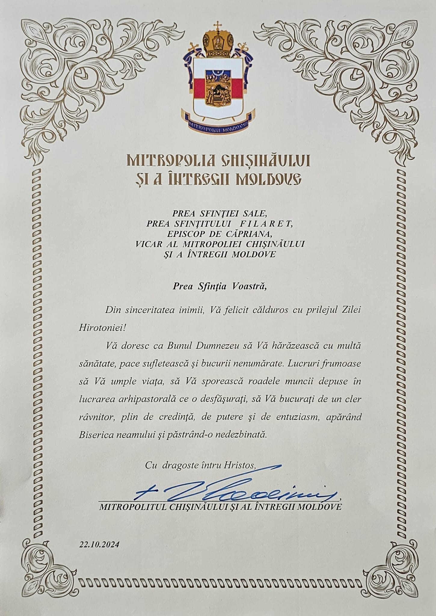 Marți, 22 octombrie 2024, Preasfințitul Filaret, Episcop de Căpriana, vicarul Mitropoliei Chișinăului și a Întregii Moldove, aniversează un an de la hirotonia în treapta de Arhiereu, cea mai înaltă demnitate lăsată de Domnul Iisus Hristos. Cu acest prilej, Înaltpreasfințitul Vladimir, Întâistătătorul Bisericii Ortodoxe din Moldova a dresat mesaj de felicitare pe care îl redăm mai jos.