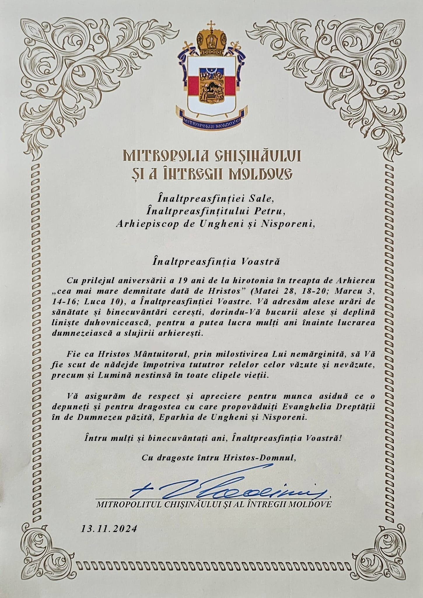 Miercuri, 13 noiembrie 2024, Înaltpreasfințitul Petru, Arhiepiscop de Ungheni și Nisporeni, aniversează 19 ani de la hirotonia în treapta de Arhiereu. Cu acest prilej, Înaltpreasfințitul Mitropolit Vladimir, Întâistătătorul Bisericii Ortodoxe din Moldova a dresat mesaj de felicitare pe care îl redăm mai jos.