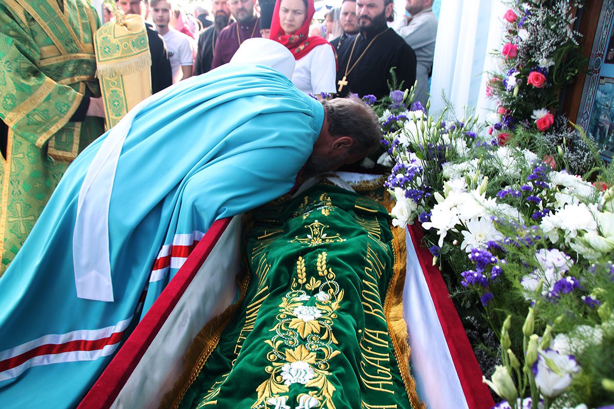 Spre final, momente înălțătoare, de aleasă bucurie au trăit ierarhii, preoții și credincioșii, când a fost intonat Troparul Sfintei, timp în care Înaltpreasfințitul Mitropolit Vladimir, dimpreună cu întreg soborul rugător au dat cinstea cuvenită, închinându-se la racla cu moaștele Sfintei Fericitei Agafia.