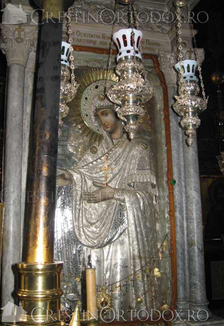 Icoana este asezata intr-o strana de marmura alba, masiva si frumos lucrata. Strana de marmura in care sta asezata icoana a fost lucrata in anul 1896, de catre sculptorul George Philippotis din Tinos. Aceasta a fost daruita manastirii de catre calugarii Achindin din Andros si Teofil din Lesbos.
