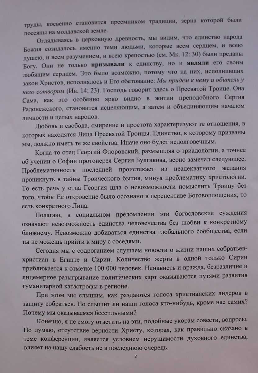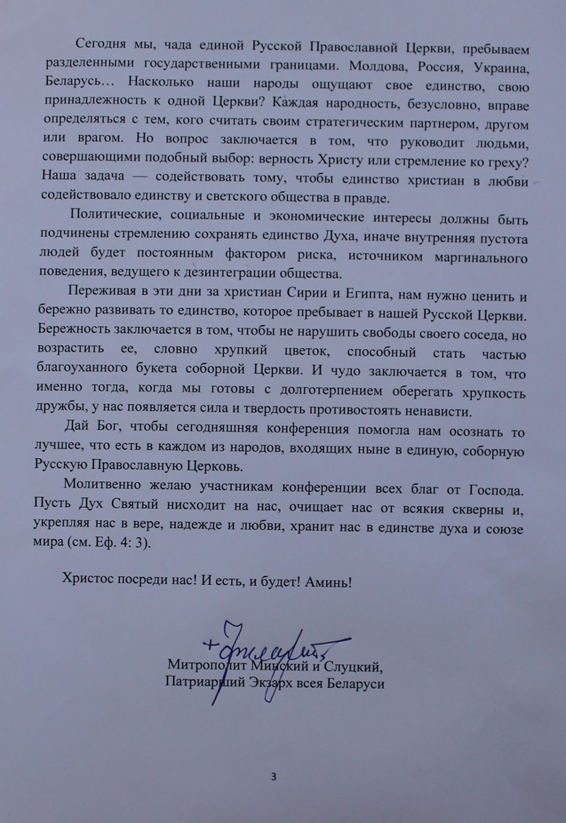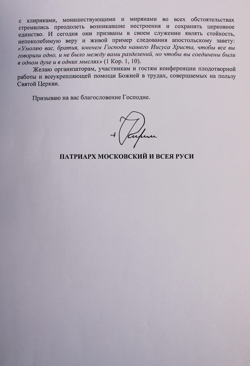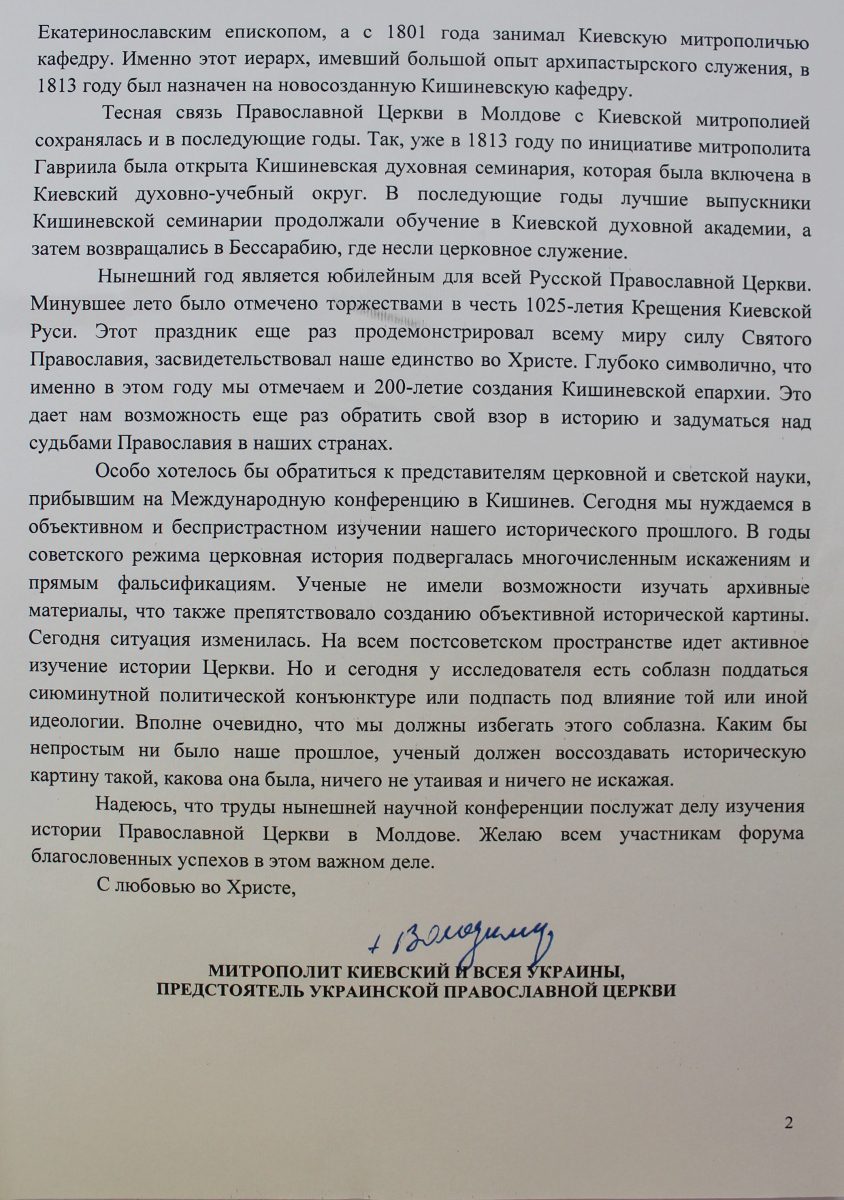 Organizarea și desfășurarea Conferinței Internaționale de la Chișinău dedicată celor două sute de ani de la întemeierea Eparhiei de Chișinău, a avut un larg ecou printre Ierarhii și confrații întru credință din întreaga Patriarhie Rusă, primul dintre cei care a venit cu un mesaj de salut participanților la eveniment fiind însuși Preafericitul Patriarh Kiril al Moscovei și al Întregii Rusii, adresând adunării următoarele cuvinte călduroase:
