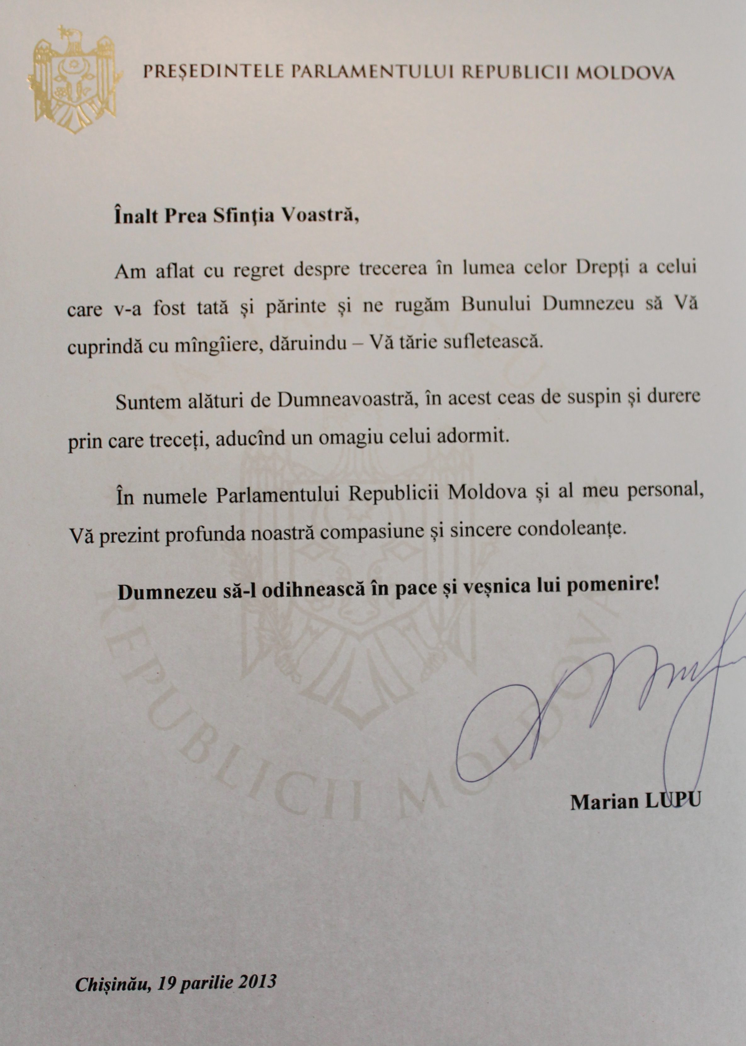 Mesajul de condoleanțe al Președintelui Parlamentului Republicii Moldova, Domnul Marian Lupu, adresat ÎPS Mitropolit Vladimir: