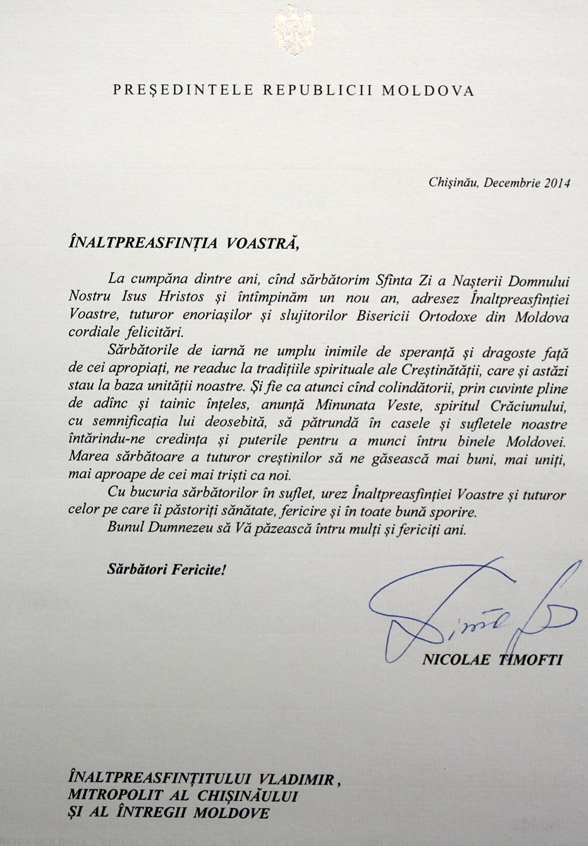 Cu prilejul luminosului praznic al Nașterii Domnului nostru Iisus Hristos, Domnul Președinte Nicolae Timofti, i-a adresat Înaltpreasfințitului Mitropolit Vladimir, un mesaj de felicitare: