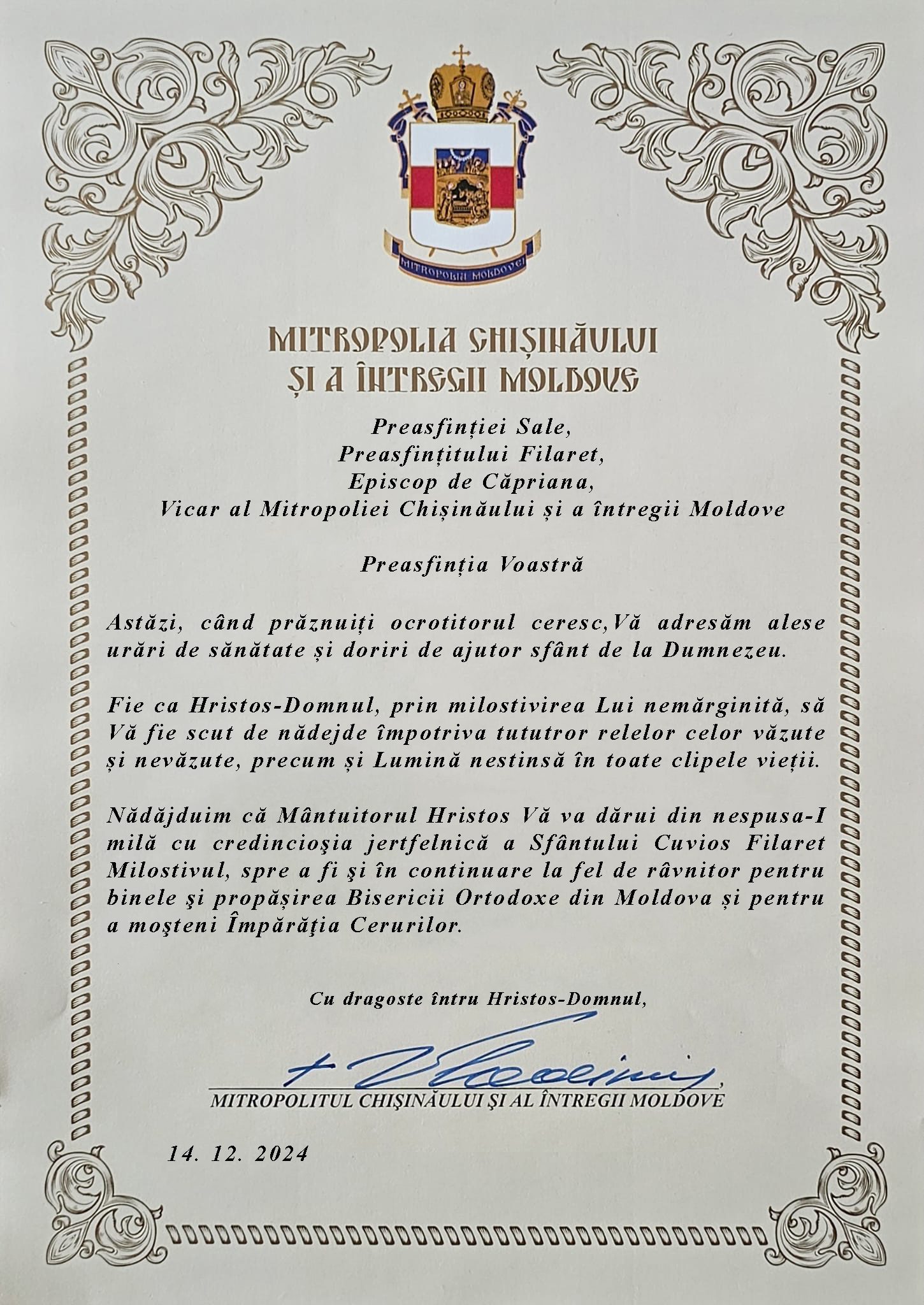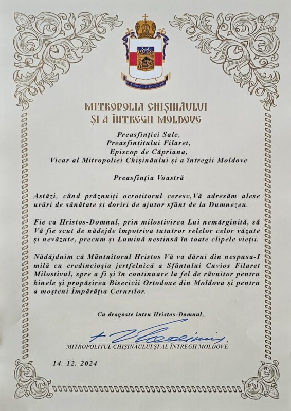 Mesajul Înaltpreasfințitului Mitropolit Vladimir adresat Preasfințitului Episcop Filaret de Căpriana, în ziua prăznuirii ocrotitorului ceresc