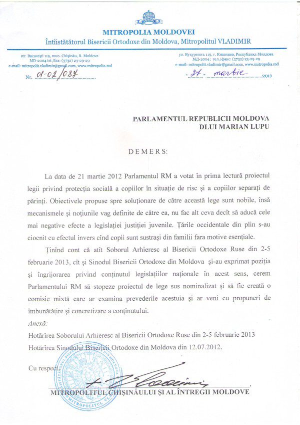 Menţionăm că Înalt Prea Sfinţitul Mitropolit Vladimir, încă de la începutul discuţiilor referitoare la crearea şi implementarea unei legi menită să protejeze copii aflaţi în situaţii de risc a luat o atitudine promptă şi hotărâtă, militând pentru un proiect legislativ adaptat realităţilor noastre şi care să nu repete greşelile legilor similare aprobate în alte ţări europene. În această ordine de idei, Înalt Prea Sfinţia Sa a adresat Parlamentului Republicii Moldova scrisoarea deschisă despre care se menţionează mai sus şi care a determinat iniţierea unui dialog mixt pentru identificarea unui proiect legislativ cu adevărat funcţionabil şi lipsit de oricare riscuri socio-morale pentru copiii vizaţi de această lege.