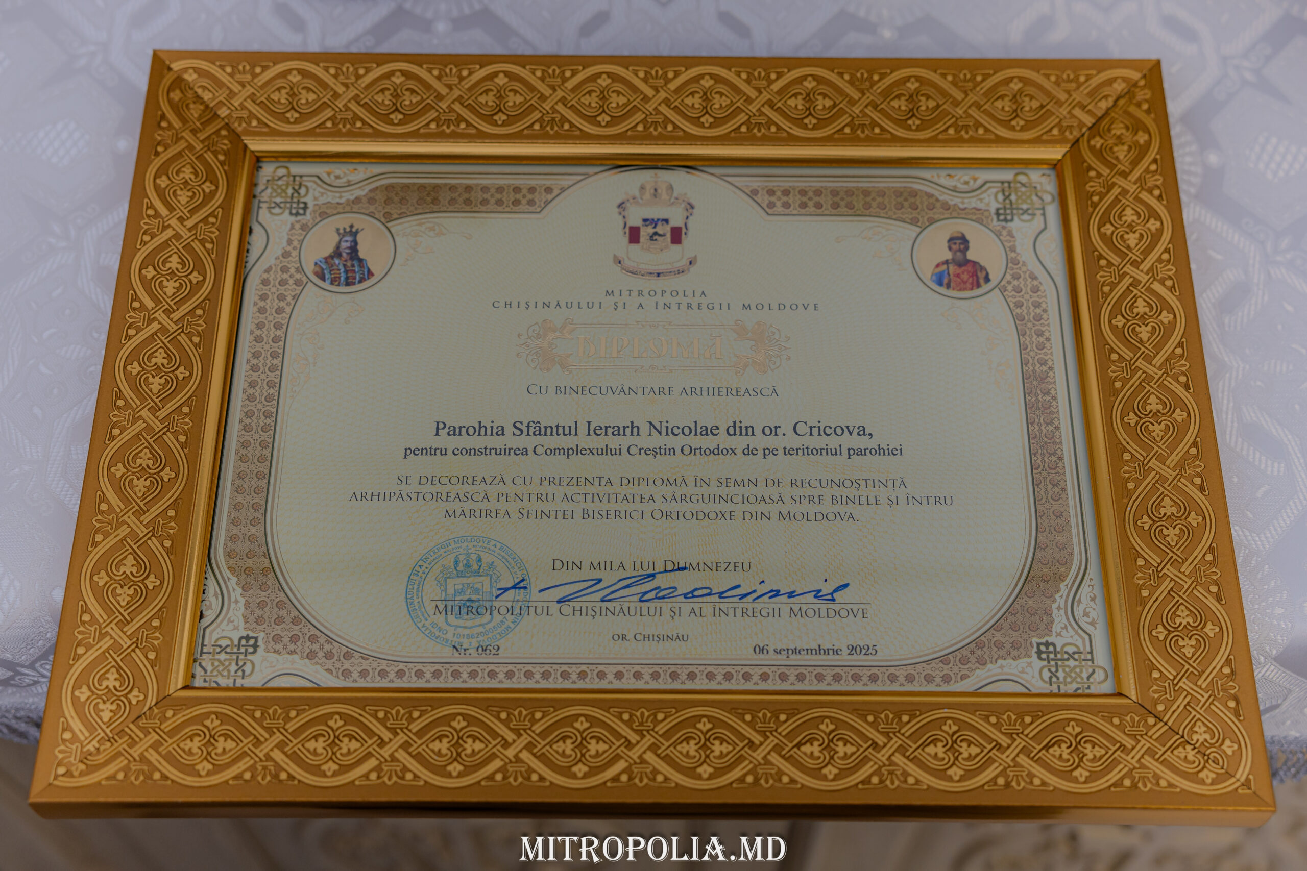 Ca semn de recunoștință pentru munca depusă, Mitropolitul a oferit tuturor credincioșilor parohiei „Sfântul Ierarh Nicolae” din Cricova Diploma de Recunoștință, pentru jertfa și truda fiecărui în parte, la veșnicia și nemurirea sufletului lor.