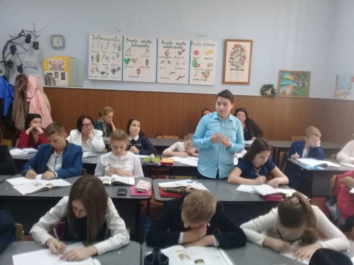 Lecţia a fost realizată cu elevii clasei a V-a şi s-a propus tema “Întemeierea Bisericii Creştine”, asistând un grup de pedagogi din cadrul instituţiei în frunte cu doamna director Stela Scripliuc.