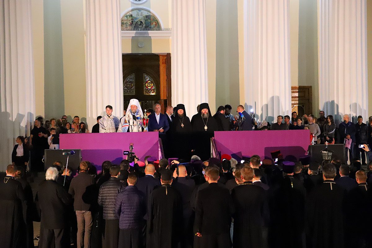 Ajungând în scuarul Catedralei Mitropolitane, Întâistătătorul s-a adresat către popor, vestind tuturor că şi în acest an Mântuitorul s-a milostivit de turma Sa, trimițând din cer semnul minunat al dragostei Sale pentru creștinii drept-măritori.