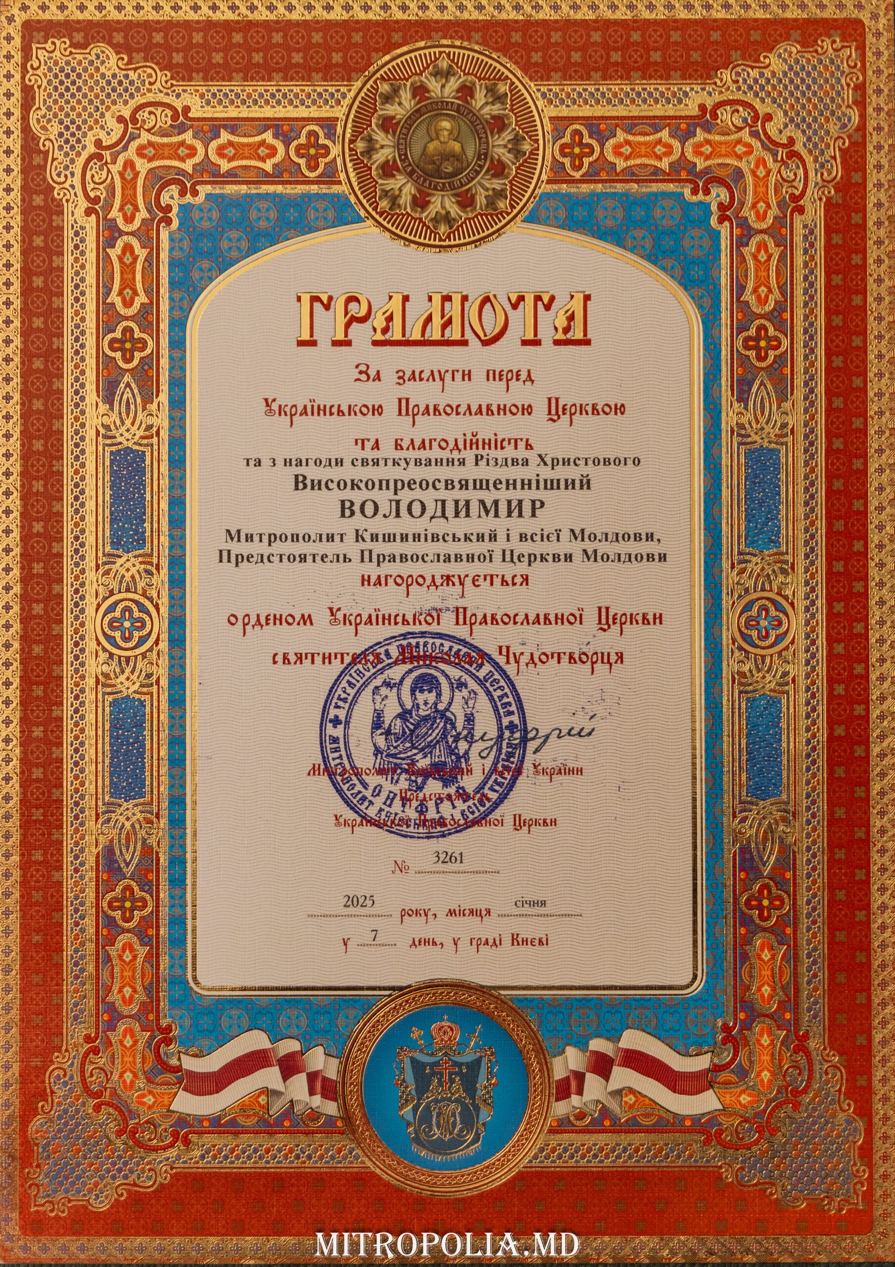 În cadrul ședinței Sinodului Bisericii Ortodoxe din Moldova, din 11 martie 2025, Înaltpreasfințitul Petru, Arhiepiscop de Ungheni și Nisporeni, i-a transmis Înaltpreasfințitului Mitropolit Vladimir – Ordinul Bisericii Ortodoxe a Ucrainei „Sfântul Ierarh Nicolae, Făcătorul de Minuni”, distincție acordată de Preafericitul Onufrie, Mitropolitul Kievului și al Întregii Ucraine, cu prilejul aniversării a 35 de ani de arhierie, în semn de recunoștință pentru munca pe care o depune spre binele Bisericii Ortodoxe din Molodva dar și pentru rugăciunile înălțate pentru pacea și bunăstarea între popoare.