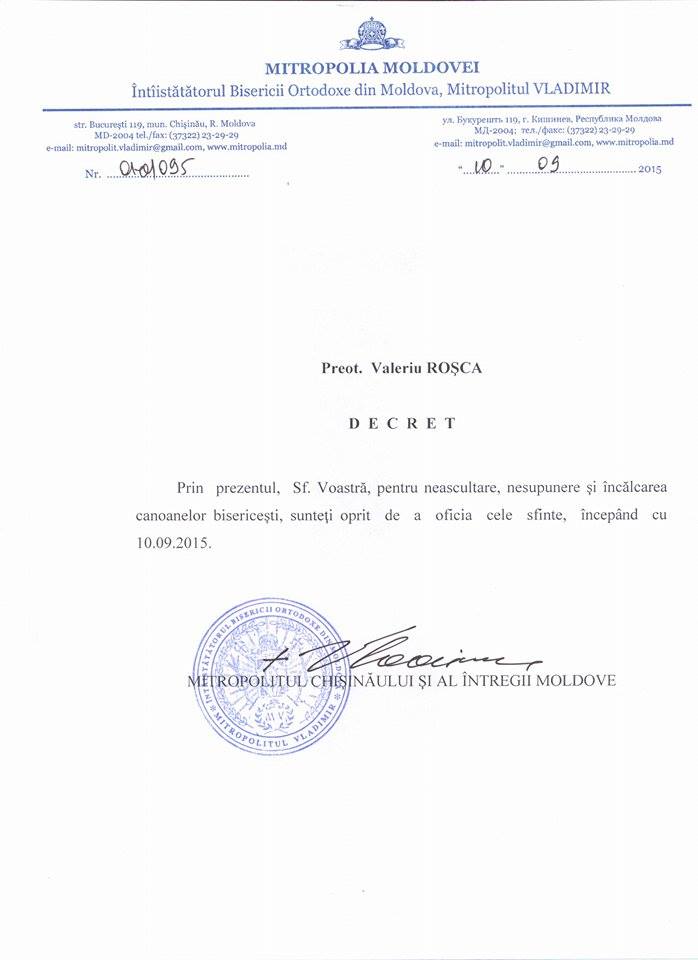 Prin Decret Mitropolitan, Prot. Valeriu Roșca a fost oprit din a oficia cele sfinte.