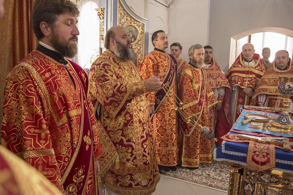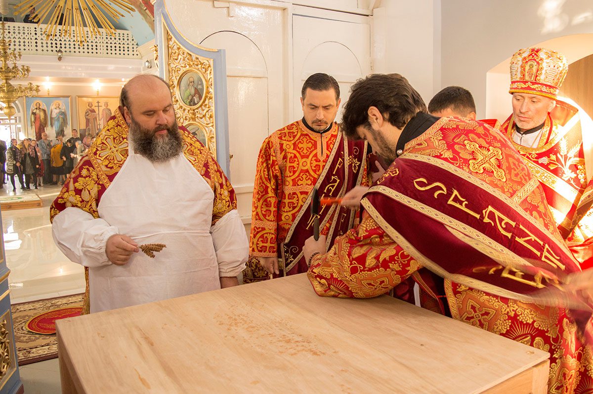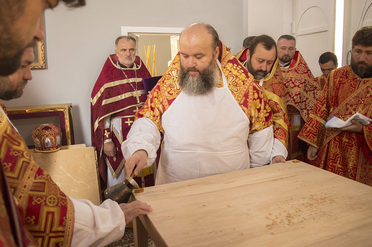 După întâmpinarea arhiereului a urmat slujba de sfințire a noului Prestol și a bisericii, respectiv spălarea și ungerea Prestolului și toate cele prescrise în rânduiala slujbei de târnosire.