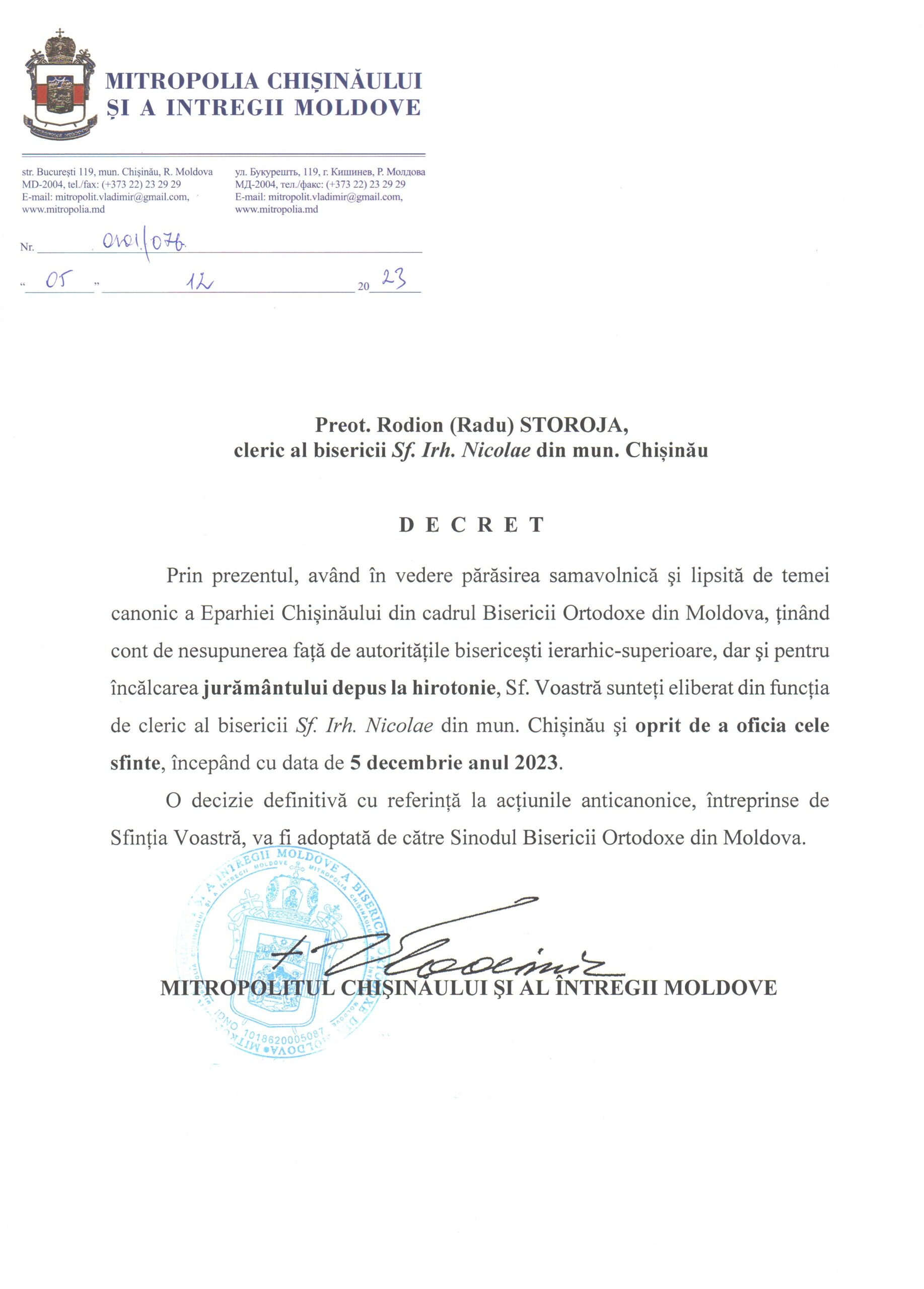 - Preot Radu Storoja, cleric al bisericii „Sf. Irh. Nicolae” din mun. Chișinău, începând cu data de 5 decembrie 2023,