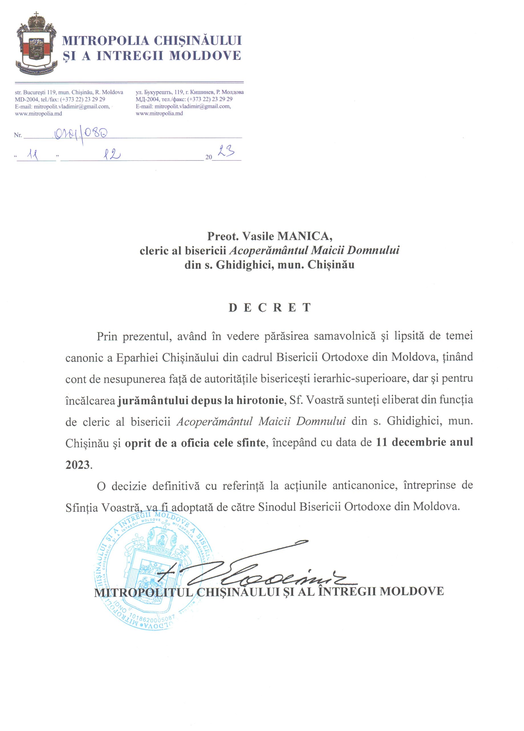 - Preot Vasile Manica, cleric al bisericii „Acoperământul Maicii Domnului” din s. Ghidighici, mun. Chișinău, începând cu data de 11 decembrie 2023.