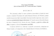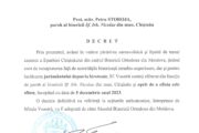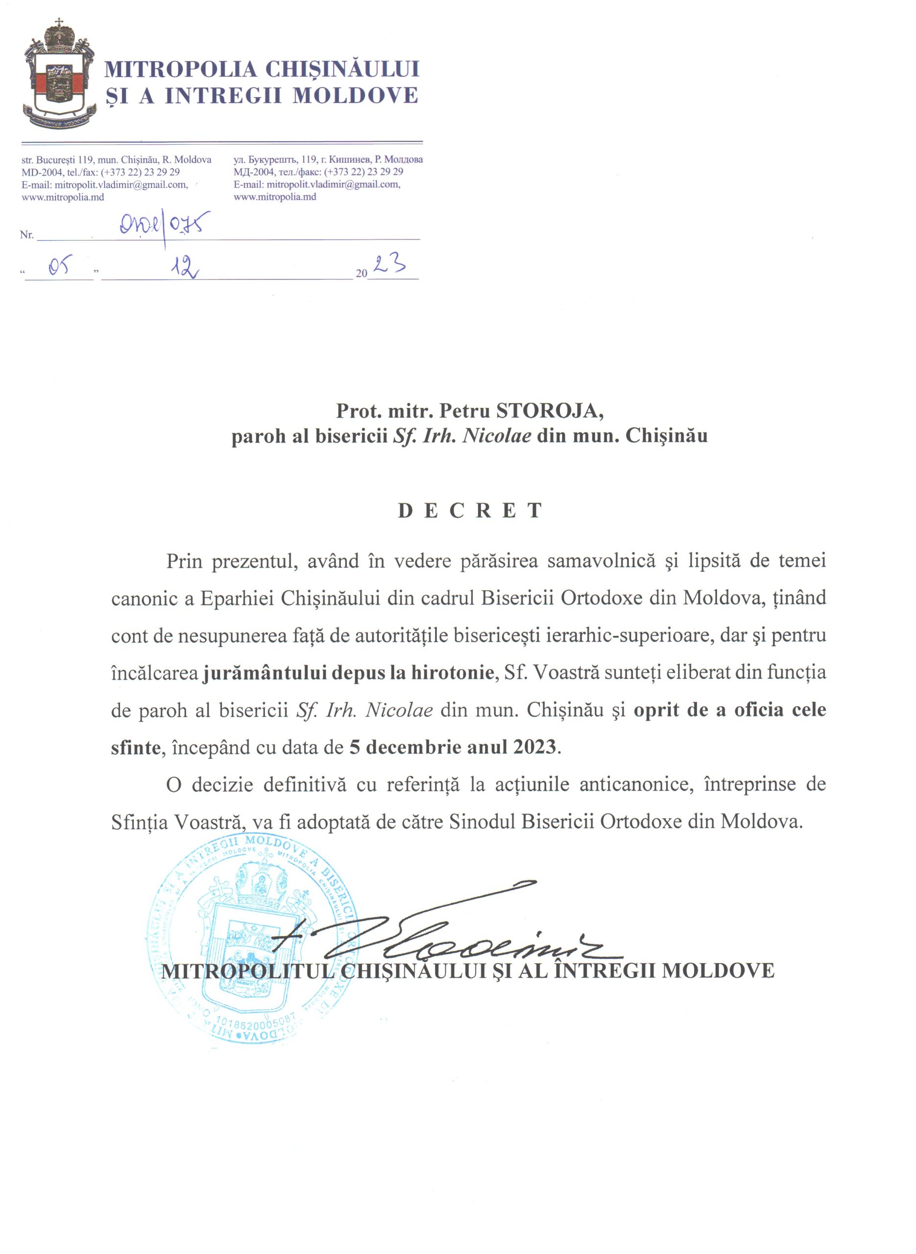 - Prot. mitr. Petru Storoja, paroh al bisericii „Sf. Irh. Nicolae” din mun. Chișinău, începând cu data de 5 decembrie 2023,
