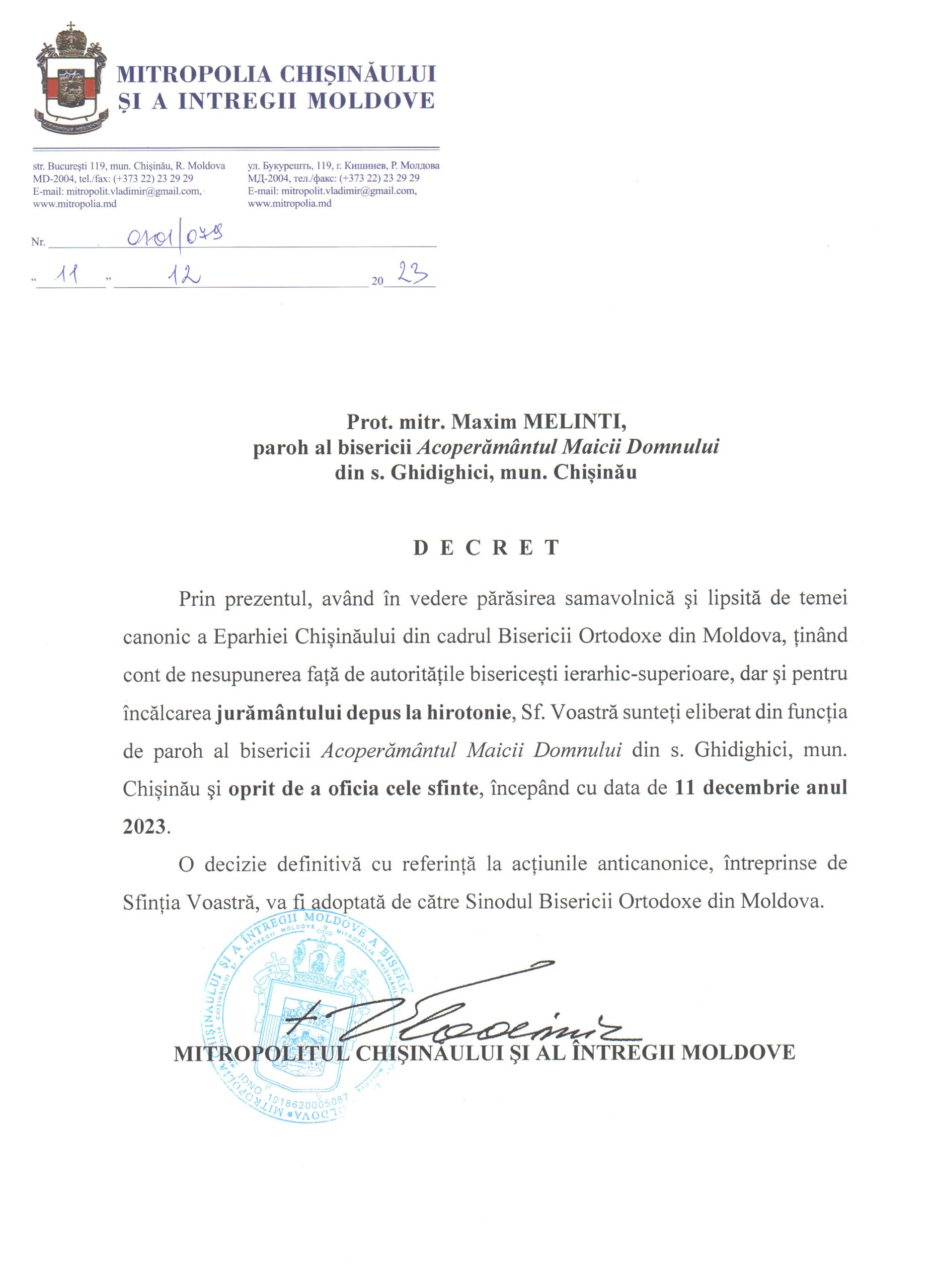 - Prot. mitr. Maxim Melinti, paroh al bisericii „Acoperământul Maicii Domnului” din s. Ghidighici, mun. Chișinău, începând cu data de 11 decembrie 2023,