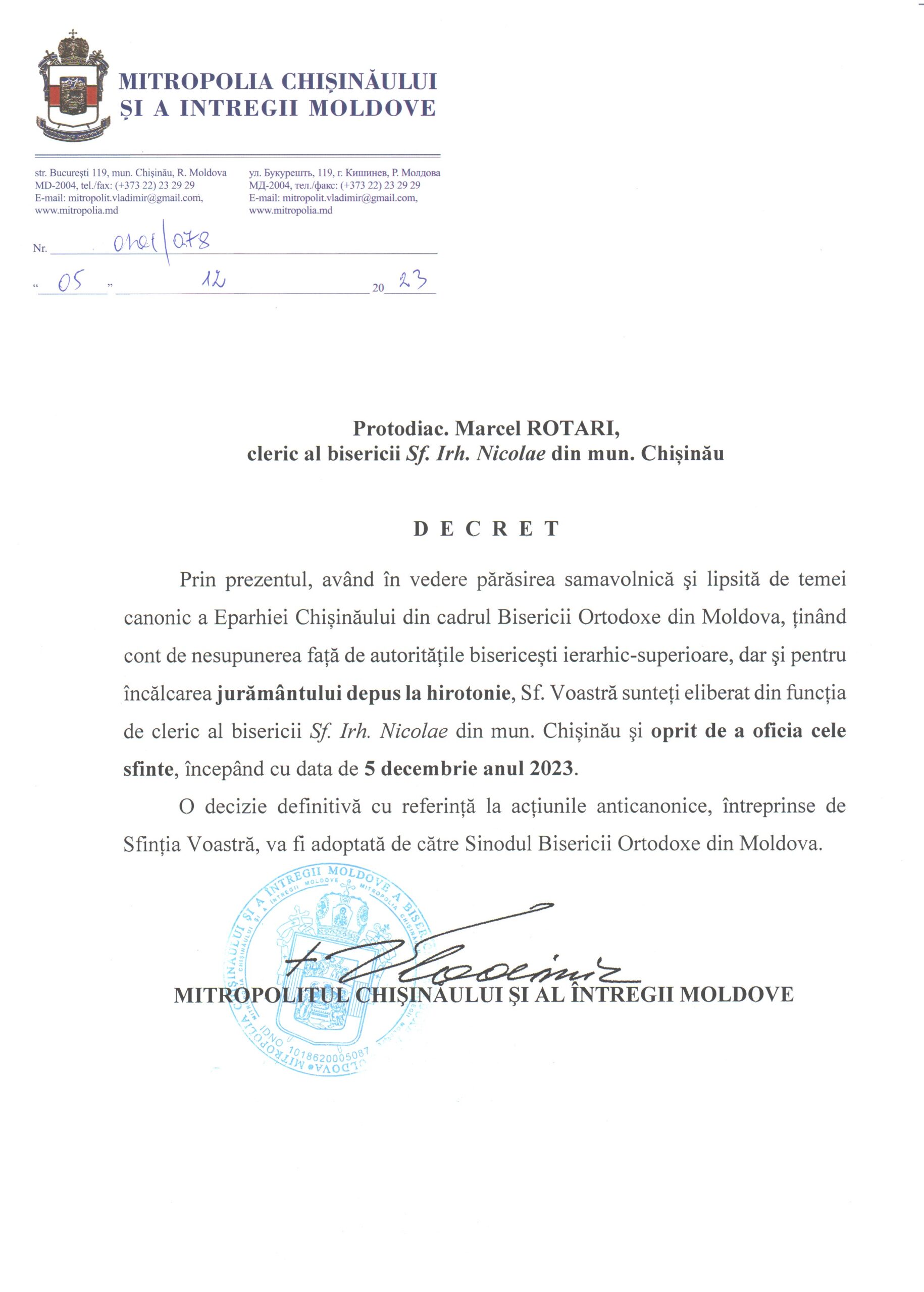 - Protodiacon Marcel Rotari, cleric al bisericii „Sf. Irh. Nicolae” din mun. Chișinău, începând cu data de 5 decembrie 2023,