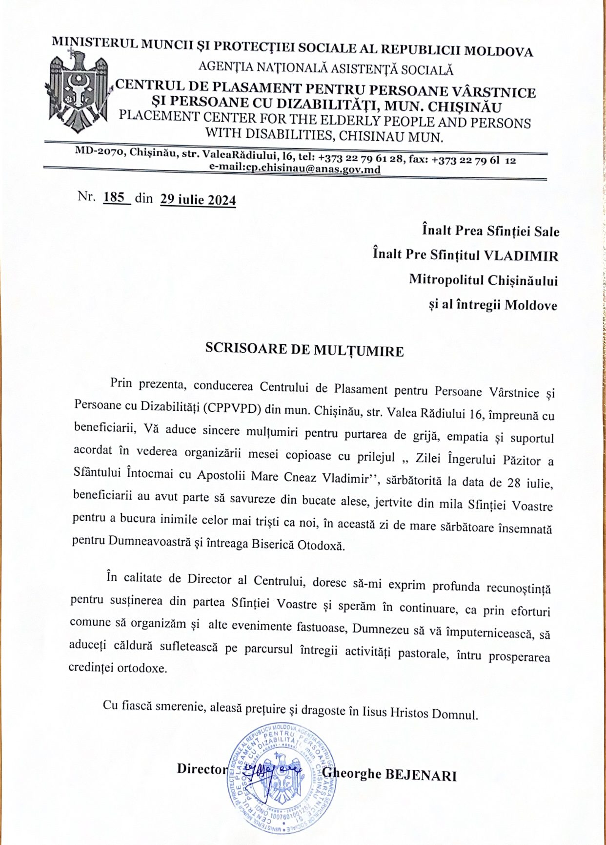 Scrisoare de mulțumire adresată ÎPS Mitropolit Vladimir din partea conducerii Centrului de Plasament pentru Persoane Vârstnice și Persoane cu Dizabilități (CPPVPD) din mun. Chișinău.