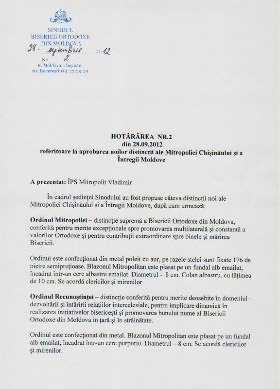 referitoare la aprobarea noilor distincţii ale Mitropoliei Chişinăului şi a Întregii Moldove