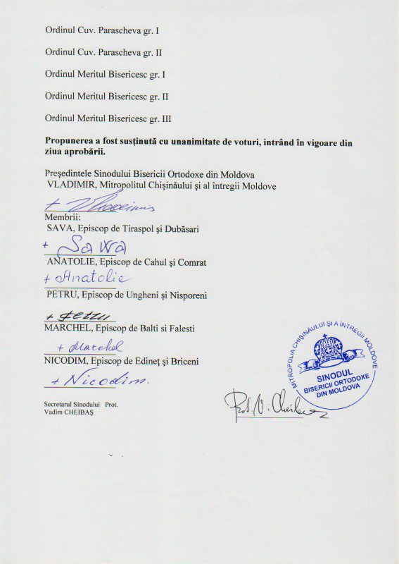 - Prezentarea noilor distincţii ale Mitropoliei Chişinăului şi a Întregii Moldove înaintate spre aprobare. Discuţii pe marginea iniţiativei.
