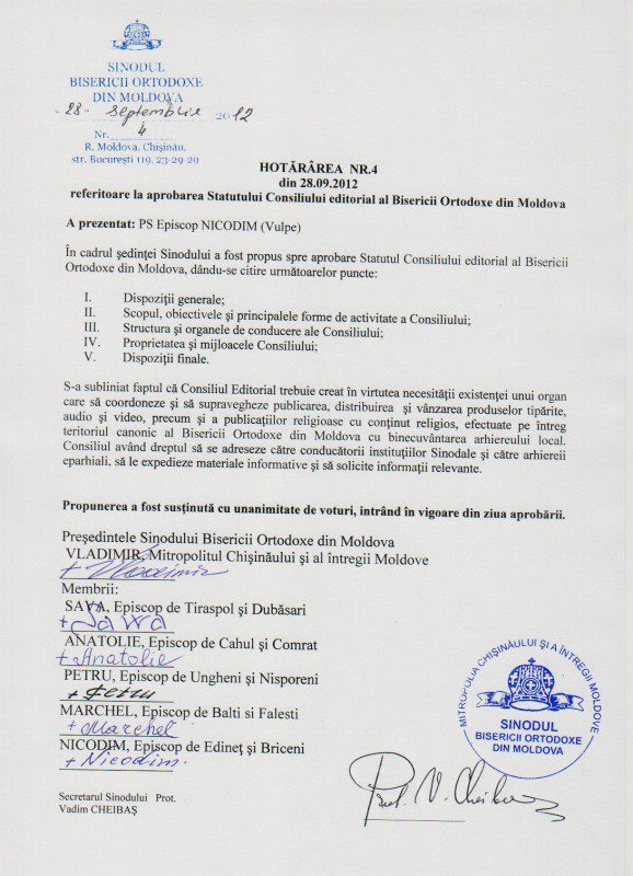 - Prezentarea spre aprobare a Statutului Consiliului editorial al Bisericii Ortodoxe din Moldova.