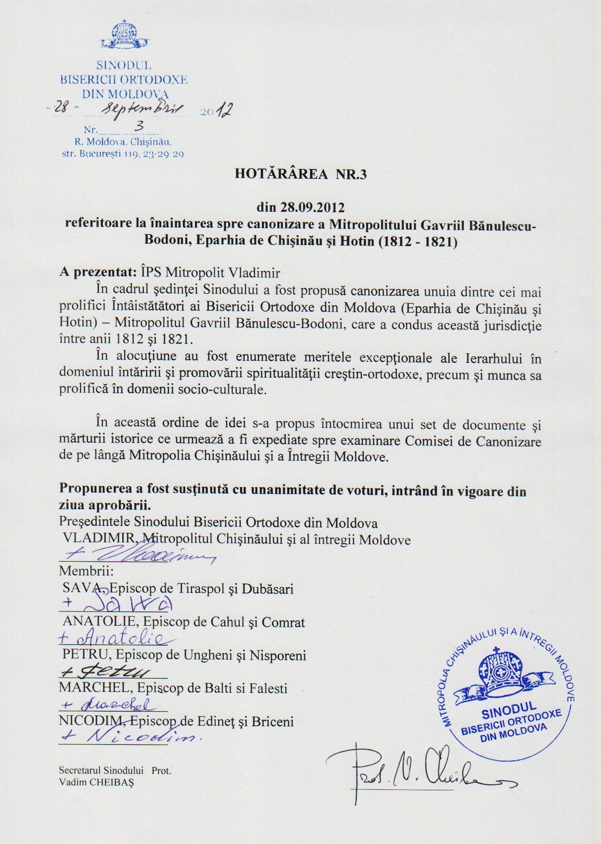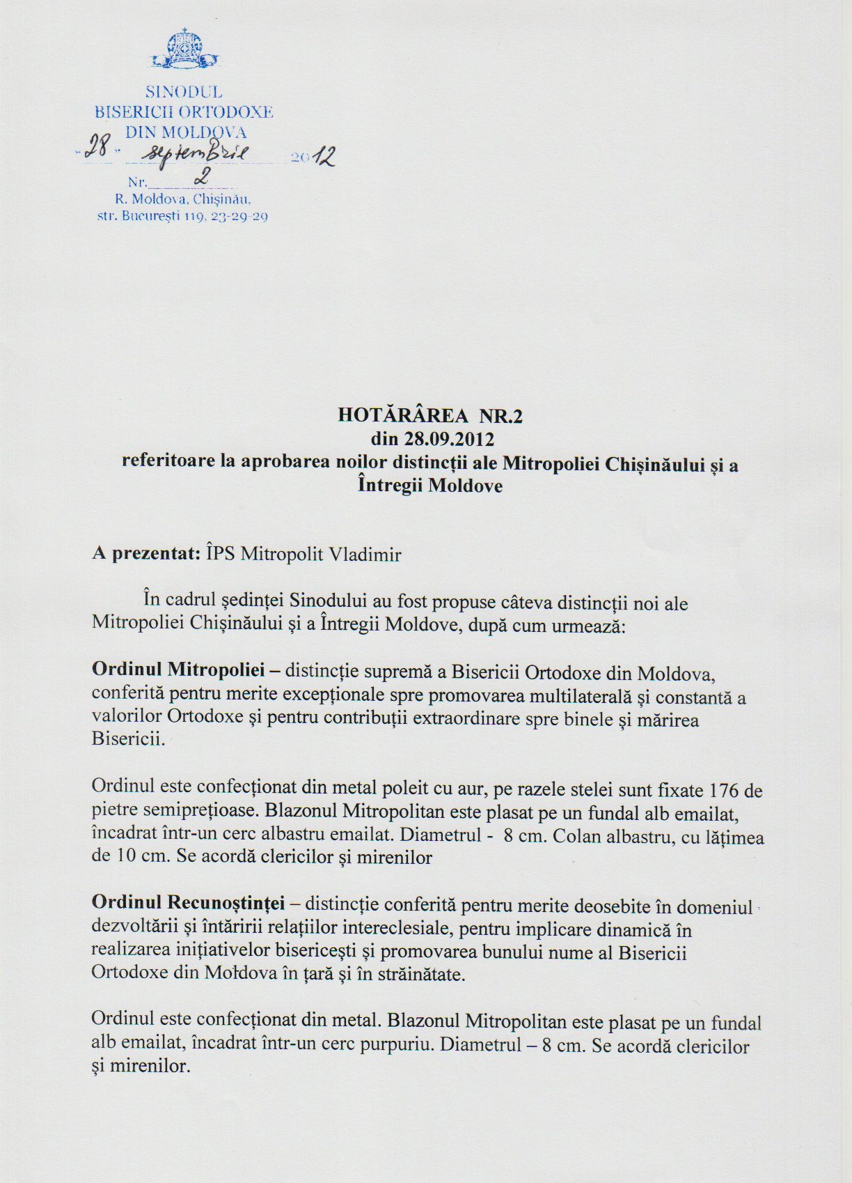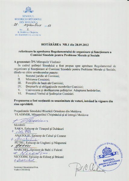 Ordinea de zi a Şedinţei Sinodului Bisericii Ortodoxe din Moldova din 28.09.2012: