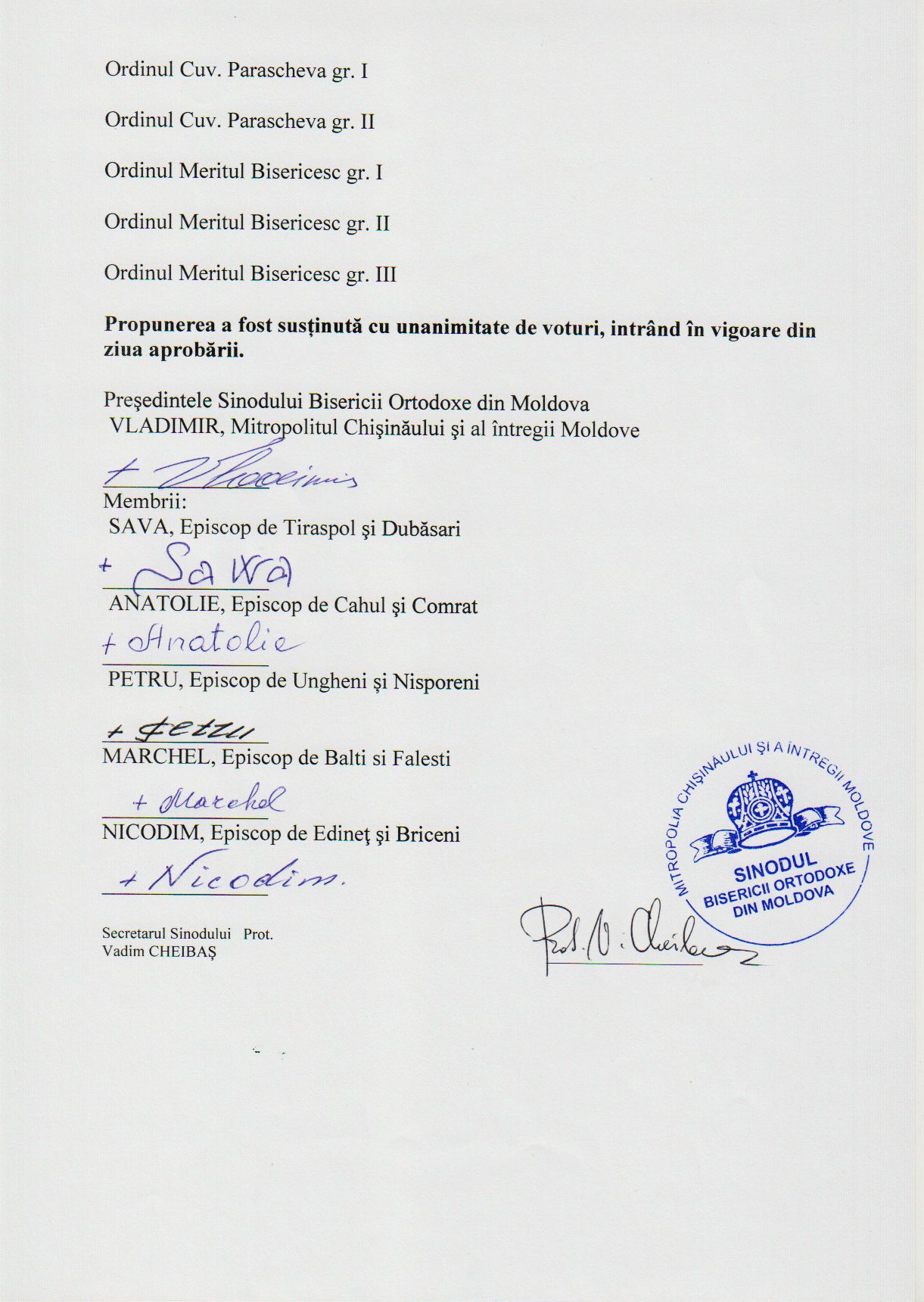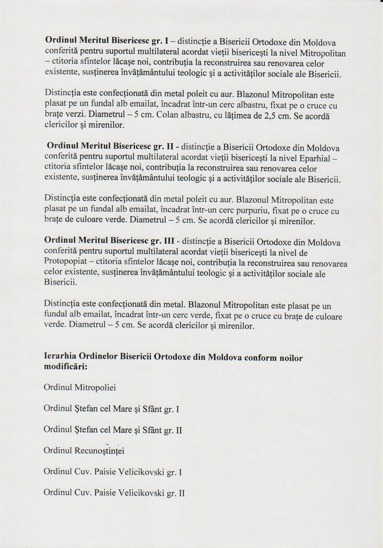 Ierarhia Ordinelor Bisericii Ortodoxe din Moldova conform noilor modificări: