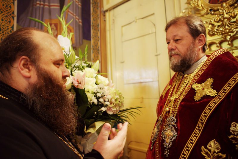 După serviciul divin, Vlădica Vladimir a primit felicitările numeroșilor slujitori și credincioși prezenți la Catedrală, printre aceștia numărându-se și PS Petru, Episcop de Ungheni și Nisporeni, care a venit către Înalt Prea Sfinția Sa cu un emoționant cuvânt de felicitrare, urându-i Întâistătătorului viață îndelungată și cât mai multe realizări bineplăcute pentru binele și mărirea Bisericii Ortodoxe din Moldova, dar mai ales mulțumindu-i pentru toată truda pe care o depune pentru luminarea și îndrumarea clerului și poporului binecredincios. Cu acest prilej, Prea Sfințitul Petru l-a decorat pe Mitropolit cu cea mai înaltă distincție a Eparhiei de Ungheni și Nisporeni – Medalia “Sf. Cneaz Alexandru Nevski”, în semn de înaltă recunoștință pentru păstorirea dreaptă și părintească a creștinilor din cuprinsul Episcopiei.