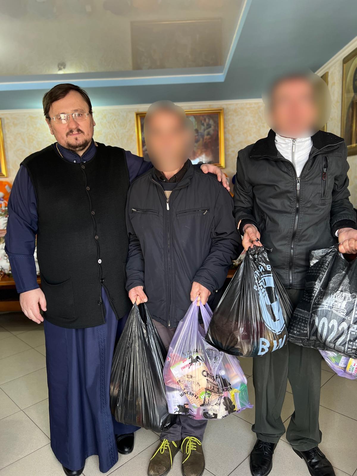 Astfel, de 5-6 ori pe an, familiile respective primesc ajutor material sub formă de pachete alimentare, sanitare, haine și lenjerie. Bolnavii țintuiți la pat sunt asigurați în măsura posibilităților cu scutece și unele medicamente. Persoanelor singuratice și bolnave le sunt distribuite prânzuri calde preparate la cantina Bisericii sau la domiciliul voluntarilor, dar și pâine, fructe, dulciuri și alte produse aduse/oferite de enoriașii Bisericii.